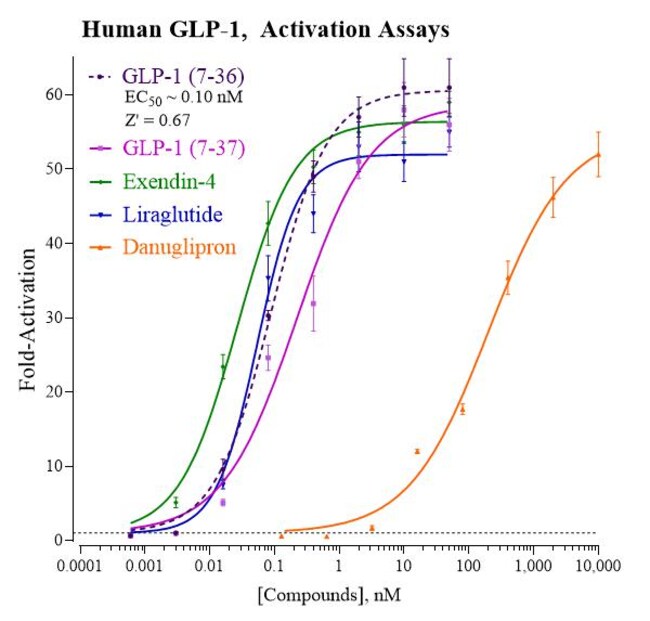 Eliminate weeks of cell culture while achieving superior sensitivity with reproducible results from this all-inclusive cell-based luciferase reporter assay. INDIGO’s Human Glucagon-Like Peptide-1 Receptor reporter assay allows you to quickly screen test samples to quantify functional activity, either agonist or antagonist, they may exert against GLP-1R. Kit includes cryopreserved reporter cells engineered to provide constitutive expression of the receptor, optimized media for use during cell thawing and in diluting test samples, reference agonist, Luciferase Detection Reagent, cell culture-ready assay plate, and detailed assay protocol. INDIGO’s unique Cryomite™ process provides exceptional cell viability post-thaw and INDIGO’s strict QA process means consistent results lot to lot (product quality data available upon request). This kit allows researchers to achieve superior sensitivity, clear, reproducible results, and eliminate weeks of cell culture work.