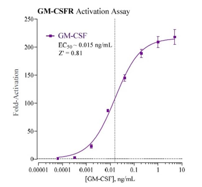 Eliminate weeks of cell culture while achieving superior sensitivity with reproducible results from this all-inclusive cell-based luciferase reporter assay. INDIGO’s Human Granulocyte-Macrophage Colony-Stimulating Factor Receptor reporter assay allows you to quickly screen test samples to quantify functional activity, either agonist or antagonist, they may exert against GM-CSFR. Kit includes cryopreserved reporter cells engineered to provide constitutive expression of the receptor, optimized media for use during cell thawing and in diluting test samples, reference agonist, Luciferase Detection Reagent, cell culture-ready assay plate, and detailed assay protocol. INDIGO’s unique Cryomite™ process provides exceptional cell viability post-thaw and INDIGO’s strict QA process means consistent results lot to lot (product quality data available upon request). This kit allows researchers to achieve superior sensitivity, clear, reproducible results