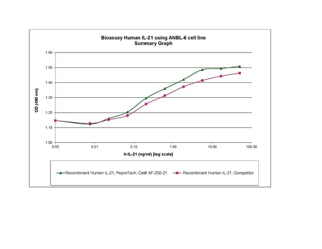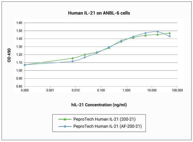Recombinant Human IL-21 is a 15.4 kDa protein consisting of 132 amino acid residues. This product is shipped at ambient temperature. For storage, handling and reconstitution information, please see the lot-specific Certificate of Analysis