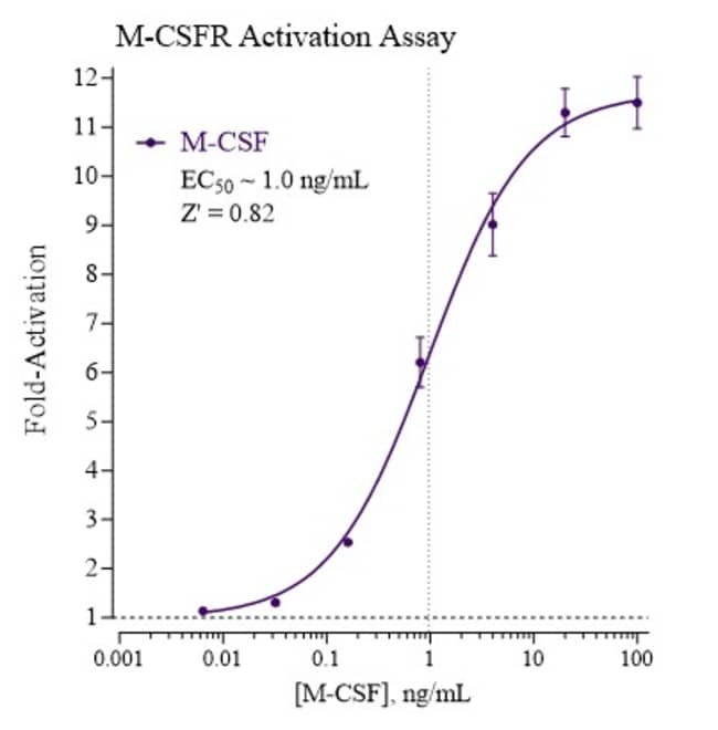 Eliminate weeks of cell culture while achieving superior sensitivity with reproducible results from this all-inclusive cell-based luciferase reporter assay. INDIGO’s Human Macrophage Colony-Stimulating Factor Receptor reporter assay allows you to quickly screen test samples to quantify functional activity, either agonist or antagonist, they may exert against M-CSFR. Kit includes cryopreserved reporter cells engineered to provide constitutive expression of the receptor, optimized media for use during cell thawing and in diluting test samples, reference agonist, Luciferase Detection Reagent, cell culture-ready assay plate, and detailed assay protocol. INDIGO’s unique Cryomite™ process provides exceptional cell viability post-thaw and INDIGO’s strict QA process means consistent results lot to lot (product quality data available upon request). This kit allows researchers to achieve superior sensitivity, clear, reproducible results, and eliminate weeks of cell culture work.