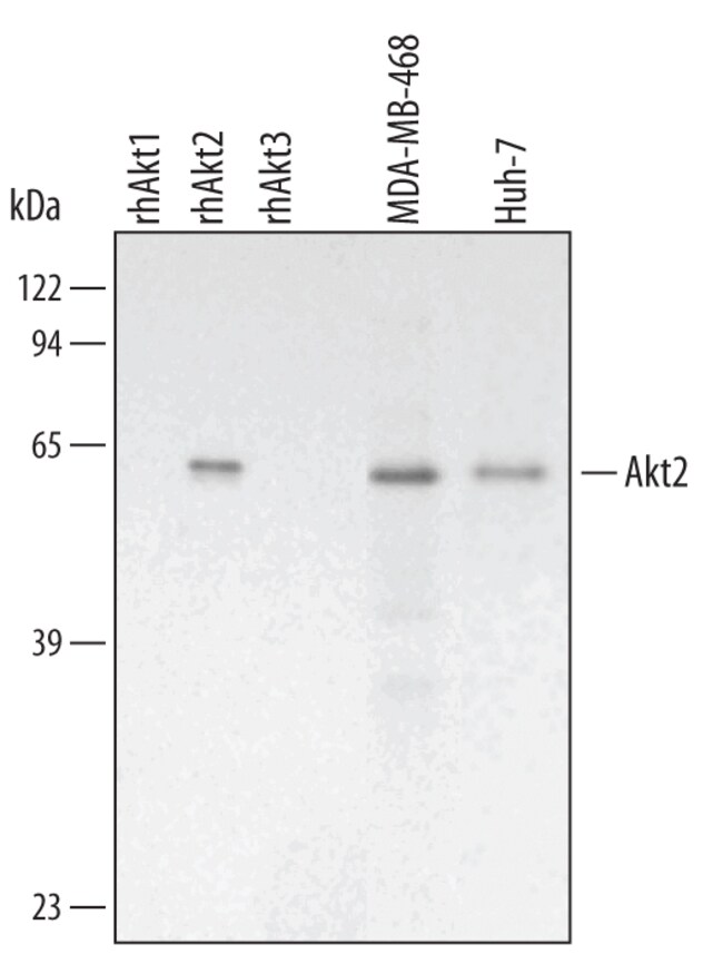 Detects human, mouse, and rat Akt2. Detects human Akt2 in direct ELISAs and endogenous Akt2 in Western blots. In direct ELISAs and Western blots, no cross-reactivity with recombinant human (rh) Akt1 or rhAkt3 is observed. | |