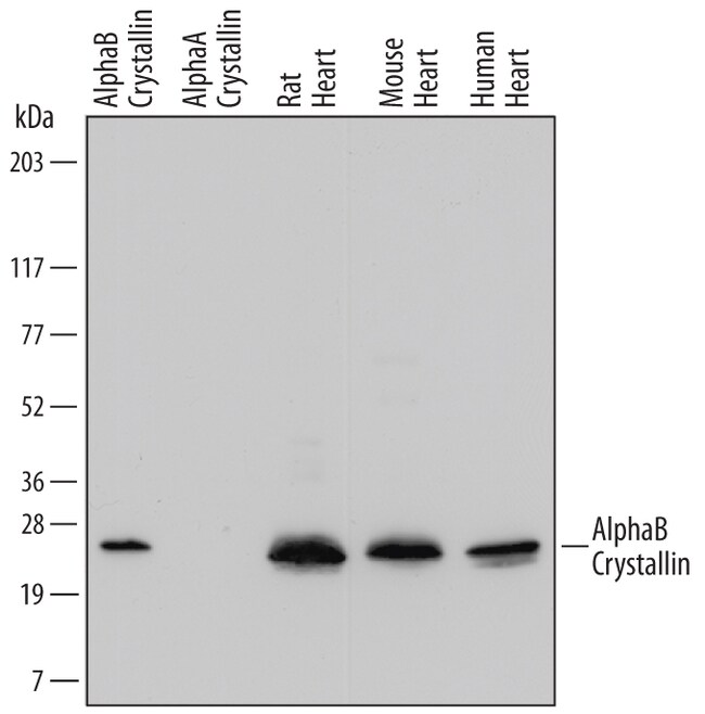 Detects human AlphaB Crystallin/CRYAB in direct ELISAs and human, mouse, and rat AlphaB Crystallin/CRYAB in Western blots. In direct ELISAs, no cross-reactivity with recombinant human AlphaA Crystallin/CRYAA is observed. | |