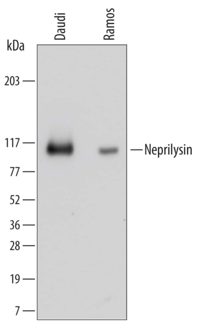 Detects human Neprilysin/CD10 in direct ELISAs and Western blots. In direct ELISAs, less than 5% cross-reactivity with recombinant mouse (rm) Neprilysin is observed, and no cross-reactivity with rmKell, recombinant human (rh) ECE-1, rhECE-2, or rhNeprilysin-2 is observed. | |