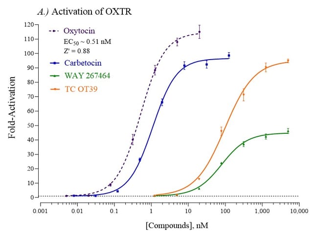 Eliminate weeks of cell culture while achieving superior sensitivity with reproducible results from this all-inclusive cell-based luciferase reporter assay. INDIGO’s Human Oxytocin Receptor (OXTR) reporter assay allows you to quickly screen test samples to quantify functional activity, either agonist or antagonist, they may exert against OXTR. Kit includes cryopreserved reporter cells engineered to provide constitutive expression of the receptor, optimized media for use during cell thawing and in diluting test samples, reference agonist, Luciferase Detection Reagent, cell culture-ready assay plate, and detailed assay protocol. INDIGO’s unique Cryomite™ process provides exceptional cell viability post-thaw and INDIGO’s strict QA process means consistent results lot to lot (product quality data available upon request). This kit allows researchers to achieve superior sensitivity, clear, reproducible results, and eliminate weeks of cell culture work.