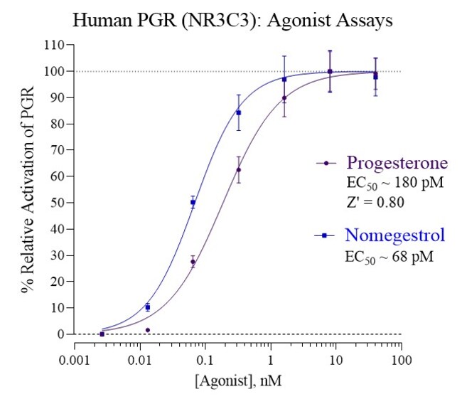 Eliminate weeks of cell culture while achieving superior sensitivity with reproducible results from this all-inclusive cell-based luciferase reporter assay. INDIGO’s Human Progesterone Receptor reporter assay allows you to quickly screen test samples to quantify functional activity, either agonist or antagonist, they may exert against PGR (NR3C3). Kit includes cryopreserved reporter cells engineered to provide constitutive expression of the receptor, optimized media for use during cell thawing and in diluting test samples, reference agonist, Luciferase Detection Reagent, cell culture-ready assay plate, and detailed assay protocol. INDIGO’s unique Cryomite™ process provides exceptional cell viability post-thaw and INDIGO’s strict QA process means consistent results lot to lot (product quality data available upon request). This kit allows researchers to achieve superior sensitivity, clear, reproducible results, and eliminate weeks of cell culture work.