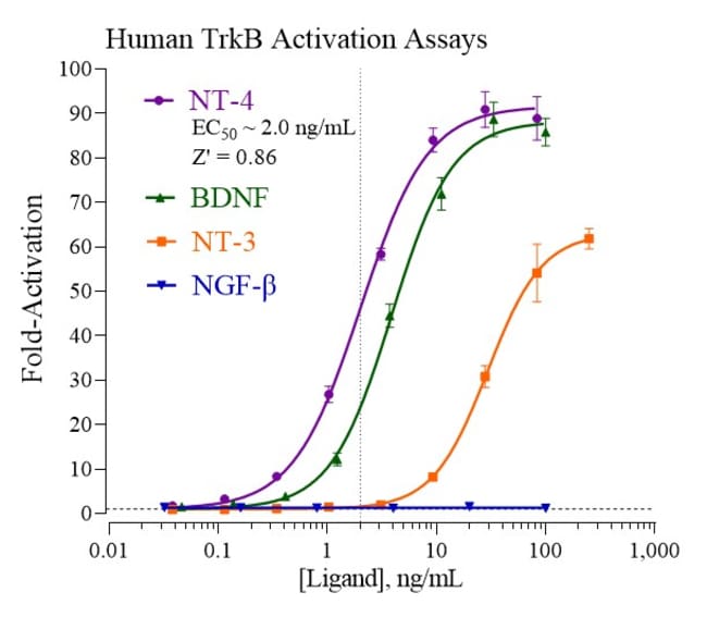 Eliminate weeks of cell culture while achieving superior sensitivity with reproducible results from this all-inclusive cell-based luciferase reporter assay. INDIGO’s Human Tropomyosin Receptor Kinase B reporter assay allows you to quickly screen test samples to quantify functional activity, either agonist or antagonist, they may exert against TrkB. Kit includes cryopreserved reporter cells engineered to provide constitutive expression of the receptor, optimized media for use during cell thawing and in diluting test samples, reference agonist, Luciferase Detection Reagent, cell culture-ready assay plate, and detailed assay protocol. INDIGO’s unique Cryomite™ process provides exceptional cell viability post-thaw and INDIGO’s strict QA process means consistent results lot to lot (product quality data available upon request). This kit allows researchers to achieve superior sensitivity, clear, reproducible results, and eliminate weeks of cell culture work.