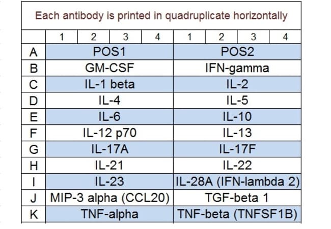 Detects 20 Human Th1, Th2, and Th17 Cytokines. Suitable for all liquid sample types. Quantitative, Sandwich-based, Glass Slide Antibody Array. Simultaneous quantitative measurement of multiple proteins in a wide variety of sample types. Quantibody combines the high specificity and sensitivity of ELISA with the high throughput of the glass chip-based array. Less sample, more data: only 50 ul of sample is needed for quantification of up to 40 cytokines. Proteins detected: GM-CSF, IFN-gamma, IL-1 beta (IL-1 F2), IL-10, IL-12 p70, IL-13, IL-17A, IL-17F, IL-2, IL-21, IL-22, IL-23, IL-28A (IFN-lambda 2), IL-4, IL-5, IL-6, MIP-3 alpha (CCL20), TGF beta 1, TNF alpha, TNF beta (TNFSF1B)