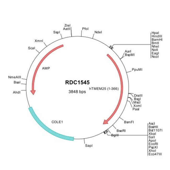 This shuttle vector contains the complete ORF for the gene of interest, along with a Kozak consensus sequence for optimal translation initiation. It is inserted NotI to AscI. The gene insert is flanked with convenient multiple cloning sites which can be used to easily cut and transfer the gene cassette into your desired expression vector.