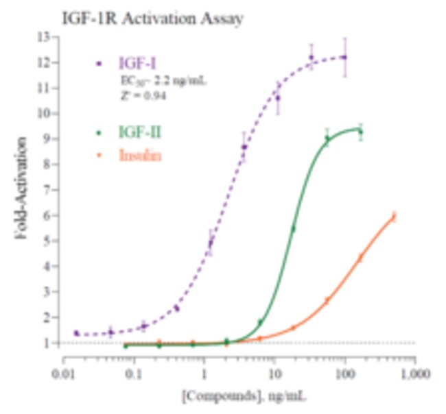 This assay kit provides the convenience of an all-inclusive cell-based reporter assay system for IGF-1R signaling. In addition to Reporter Cells, included are an optimized culture medium for use in reviving the cryopreserved cells, a culture medium for use in preparing test sample treatments, the physiological activator Insulin, Luciferase Detection Reagents, and a cell culture-ready assay plate.