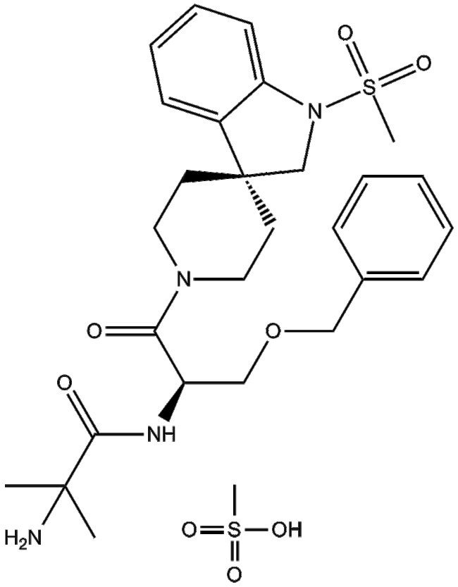 Ibutamoren mesylate (CAS 159752-10-0) also known as MK-0677 is an orally bioavailable nonpeptide growth hormone (GH) secretagogue It acts by stimulating GH release via activation of ghrelin receptors located in the pituitary and hypothalamus distinct from the classical GH-releasing hormone receptor Administration of ibutamoren mesylate results in elevated plasma concentrations of growth hormone and insulin-like growth factor 1 (IGF-1) without significantly affecting cortisol levels This compound is under investigation for its ability to enhance muscle mass and bone mineral density and is being studied as a potential therapy for conditions involving GH deficiency or age-related frailty