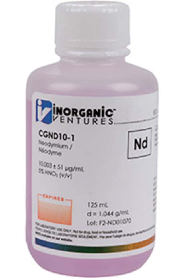 Inorganic Ventures' 10,000 ppm (µg/mL) Neodymium for ICP is a 125mL certified reference material set in a nitric acid matrix for stability. This neodymium standard is Traceable to NIST and manufactured in accordance with our stringent Quality Assurance guidelines. See Certificate of Analysis for expiration.