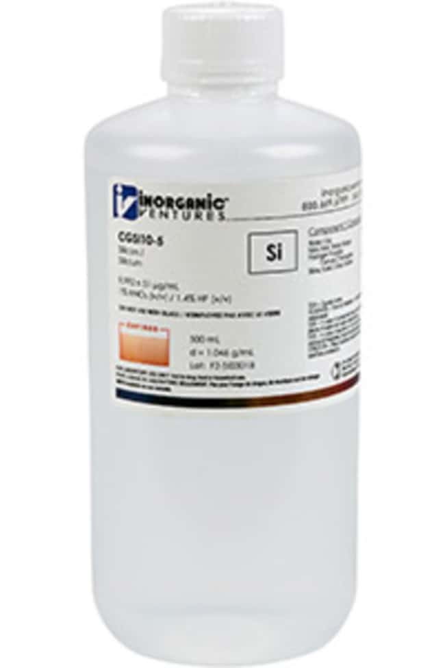 Inorganic Ventures' 10,000 ppm (µg/mL) Silicon for ICP is a 500mL certified reference material set in a nitric acid / hydrofluoric acid matrix for stability. This silicon standard is Traceable to NIST and manufactured in accordance with our stringent Quality Assurance guidelines. See Certificate of Analysis for expiration.