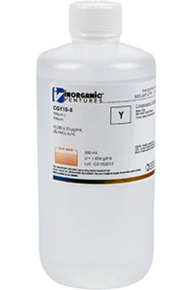 Inorganic Ventures' 10,000 ppm (µg/mL) Yttrium for ICP is a 500mL certified reference material set in a nitric acid matrix for stability. This yttrium standard is Traceable to NIST and manufactured in accordance with our stringent Quality Assurance guidelines. See Certificate of Analysis for expiration.