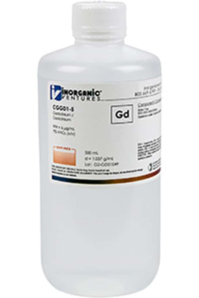 Inorganic Ventures' 1000 ppm (µg/mL) Gadolinium for ICP is a 500mL certified reference material set in a nitric acid matrix for stability. This gadolinium standard is Traceable to NIST and manufactured in accordance with our stringent Quality Assurance guidelines. See Certificate of Analysis for expiration.