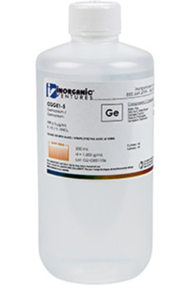 Inorganic Ventures' 1000 ppm (µg/mL) Germanium for ICP is a 500mL certified reference material set in a water / tr. nitric acid / tr. hydrofluoric acid matrix for stability. This germanium standard is Traceable to NIST and manufactured in accordance with our stringent Quality Assurance guidelines. See Certificate of Analysis for expiration.