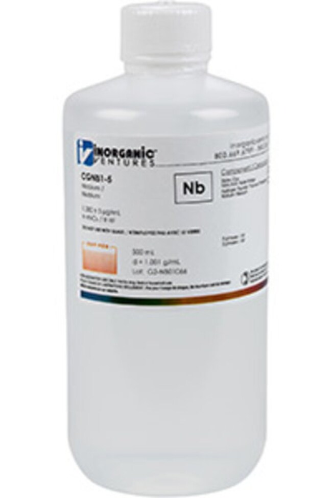 Inorganic Ventures' 1000 ppm (µg/mL) Niobium for ICP is a 500mL certified reference material set in a nitric acid / hydrofluoric matrix for stability. This niobium standard is Traceable to NIST and manufactured in accordance with our stringent Quality Assurance guidelines. See Certificate of Analysis for expiration.