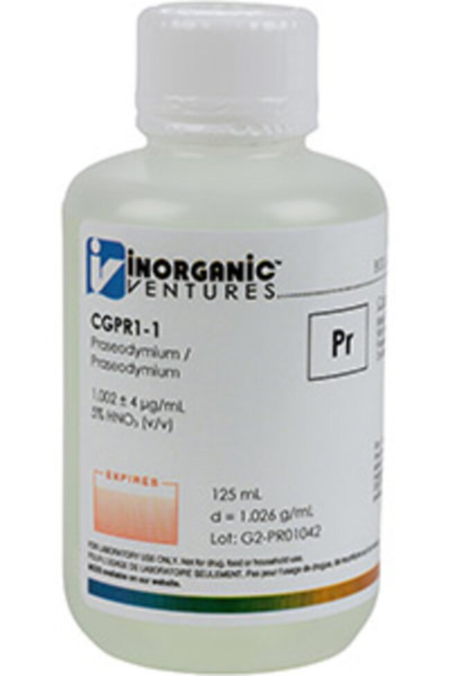 Inorganic Ventures' 1000 ppm (µg/mL) Praseodymium for ICP is a 125mL certified reference material set in a nitric acid matrix for stability. This praseodymium standard is Traceable to NIST and manufactured in accordance with our stringent Quality Assurance guidelines. See Certificate of Analysis for expiration.