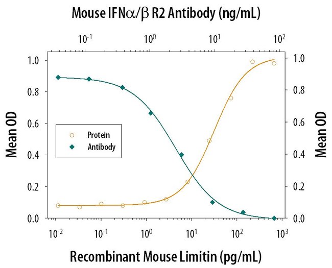 In Western blots, approximately 10% cross-reactivity with recombinant mouse (rm) IFN-gamma R2 and rmIL-20 R alpha is observed, 5% cross-reactivity with recombinant human (rh) IL-10 R beta, rmIFN-gamma RI, and rhIL-20 R beta is observed and less than 1% cross-reactivity with rhIFN-beta R alpha is observed. Reconstitute at 0.2 mg/mL in sterile PBS. Endoxin level is <0.10 EU per 1 μg of the antibody by the LAL method.