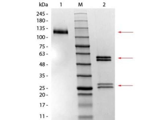 | In an Ouchterlony double diffusion assay, the material is non-reactive with antisera to mouse IgG2a, IgG2b, IgG3, IgM, and IgA. Assay by immunoelectrophoresis resulted in a single precipitin arc against anti-Mouse IgG and anti-Mouse serum. | |