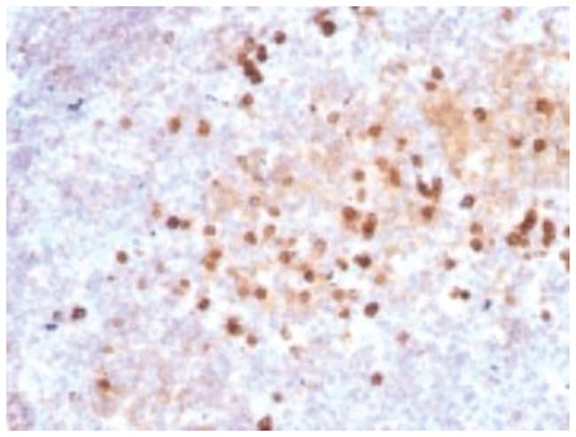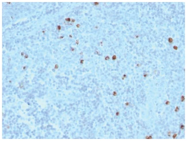 Recognizes a protein of 75kDa, identified as mu heavy chain of human immunoglobulins. It does not cross-react with alpha (IgA), gamma (IgG), epsilon (IgE), or delta (IgD), heavy chains, T-cells, monocytes, granulocytes, or erythrocytes. This MAb is useful in the identification of leukemias, plasmacytomas, and certain non-Hodgkin's lymphomas. The most common feature of these malignancies is the restricted expression of a single heavy chain class. Demonstration of clonality in lymphoid infiltrates indicates that the infiltrate is clonal and therefore malignant. | |
