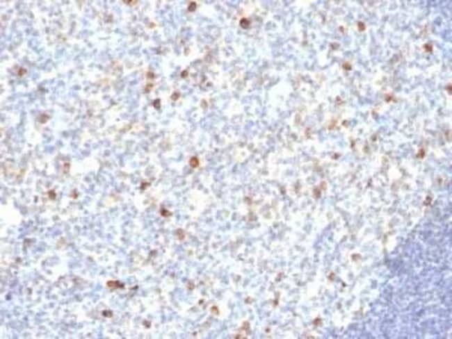 Recognizes a protein of 75kDa, identified as mu heavy chain of human immunoglobulins. It does not cross-react with alpha (IgA), gamma (IgG), epsilon (IgE), or delta (IgD), heavy chains, T-cells, monocytes, granulocytes, or erythrocytes. Monomeric IgM is expressed as a membrane bound antibody on the surface of B cells and as a pentamer when secreted by plasma cells. IgM antibody is prominent in early immune responses to most antigens. Aberrant levels are associated with immune deficiency states, hereditary deficiencies, myeloma, Waldenstrom's macroglobulinemia, chronic infection and hepatocellular disease. This MAb is useful in the identification of leukemias, plasmacytomas, and certain non-Hodgkin s lymphomas. The most common feature of these malignancies is the restricted expression of a single heavy chain class. Demonstration of clonality in lymphoid infiltrates indicates that the infiltrate is clonal and therefore malignant. |