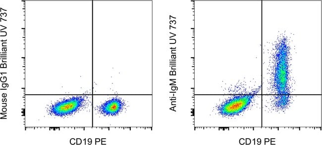 The SA-DA4 monoclonal antibody reacts with the mu heavy chain of human IgM. It does not react with other classes of human immunoglobulin including IgD, IgG, or IgA. IgM is expressed intracellularly, during early stages of B lymphopoiesis, and then on the surface of mature B cells. Our testing has revealed variations in staining of the non-B cell population that is predicted to be non-specific. This variation can be attributed to both donor variability and the anticoagulant used during blood draw. Therefore, we recommend using sodium citrate as the anticoagulant to minimize non-specific staining by this antibody. Applications Reported: This SA-DA4 antibody has been reported for use in flow cytometric analysis. Applications Tested: This SA-DA4 antibody has been pre-diluted and tested by flow cytometric analysis of normal human peripheral blood cells. This may be used at 5 μL (0.5 μg) per test. A test is defined as the amount (μg) of antibody that will stain a cell sample in a final volume of 100 μL. Cell number should be determined empirically but can range from 10^5 to 10^8 cells/test. Brilliant Ultraviolet 737 is a tandem dye that emits at 732 nm and is intended for use on cytometers equipped with an ultraviolet (355 nm) laser.