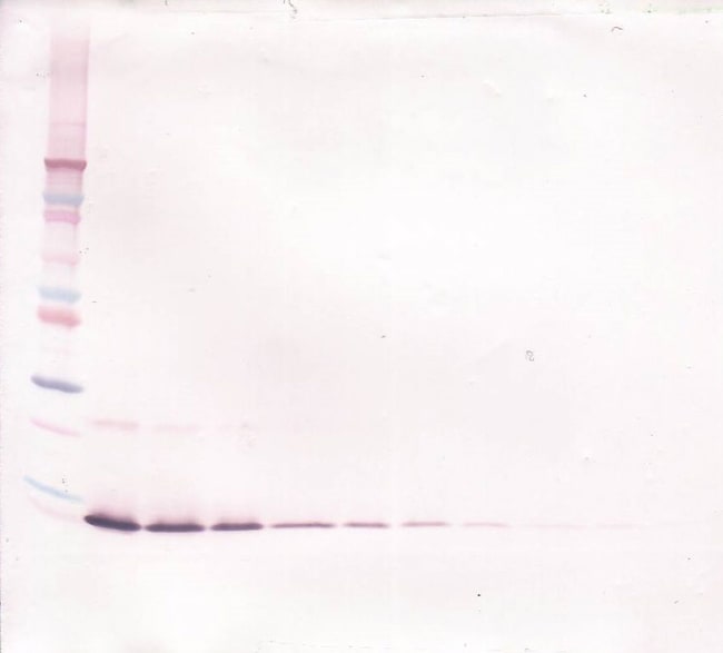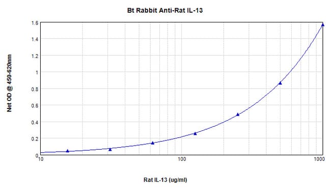 AA Sequence of recombinant protein: TPGPVRRSTS PPVALRELIE ELSNITQDQK TSLCNSSMVW SVDLTAGGFC AALESLTNIS SCNAIHRTQR ILNGLCNQKA SDVASSPPDT KIEVAQFISK LLNYSKQLFR YGH. Preparation: Produced from sera of rabbits immunized with highly pure Recombinant Rat IL-13. Anti-Rat IL-13-specific antibody was purified by affinity chromatography and then biotinylated. Sandwich ELISA: To detect Rat IL-13 by sandwich ELISA (using 100 mL/well) a concentration of 0.25-1.0 μg/mL of this antibody is required. This biotinylated polyclonal antibody, in conjunction with PeproTech Polyclonal Anti- Rat IL-13 (500-P224) as a capture antibody, allows the detection of at least 0.2-0.4 ng/well of Recombinant Rat IL-13. Western Blot: To detect Rat IL-13 by Western Blot analysis this antibody can be used at a concentration of 0.1-0.2 mg/mL. When used in conjunction with compatible development reagents the detection limit for Recombinant Rat IL-13 is 1.5-3.0 ng/lane, under either reducing or non-reducing conditions. 500-P224BT-1MG will be provided as 2 x 500 μg