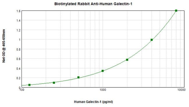 AA Sequence of recombinant protein: ACGLVASNLN LKPGECLRVR GEVAPDAKSF VLNLGKDSNN LCLHFNPRFN AHGDANTIVC NSKDGGAWGT EQREAVFPFQ PGSVAEVCIT FDQANLTVKL PDGYEFKFPN RLNLEAINYM AADGDFKIKC VAFD. Preparation: Produced from sera of rabbits immunized with highly pure Recombinant Human Galectin-1. Anti-Human Galectin-1-specific antibody was purified by affinity chromatography and then biotinylated. Sandwich ELISA: To detect hGalectin-1 by sandwich ELISA (using 100 μL/well antibody solution) a concentration of 0.25-1.0 μg/mL of this antibody is required. This biotinylated polyclonal antibody, in conjunction with PeproTech Polyclonal Anti-Human Galectin-1 (500-P210) as a capture antibody, allows the detection of at least 0.2-0.4 ng/well of Recombinant hGalectin-1. Western Blot: To detect hGalectin-1 by Western Blot analysis this antibody can be used at a concentration of 0.1-0.2 μg/mL. Used in conjunction with compatible secondary reagents the detection limit for Recombinant hGalectin-1 is 1.5-3.0 ng/lane, under either reducing or non-reducing conditions. 500-P210BT-1MG will be provided as 2 x 500 μg