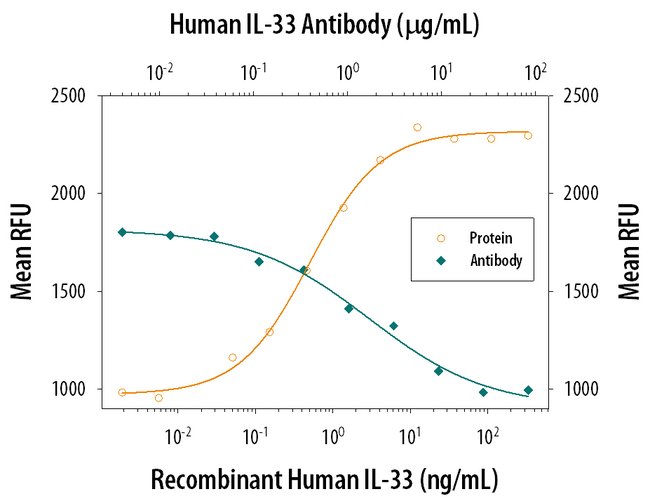 In sandwich ELISAs, less than 0.05% cross-reactivity with recombinant mouse (rm) IL-33 is observed. Reconstitute at 0.2 mg/mL in sterile PBS. Endoxin level is <0.10 EU per 1 μg of the antibody by the LAL method.