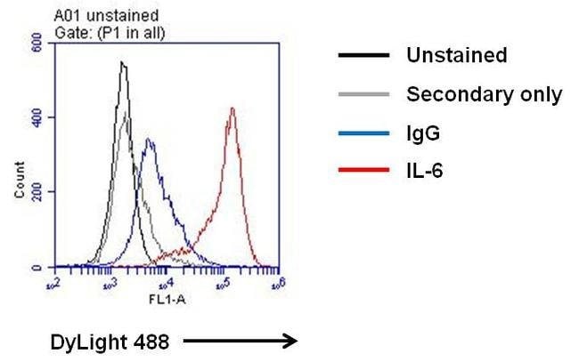 701028 was successfully to detect IL-6 in Flow application. Intact IgG appears on a non-reducing gel as ~150 kDa band and upon reduction generating a ~25 kDa light chain band and a ~50 kDa heavy chain. Recombinant rabbit monoclonal antibodies are produced using in vitro expression systems. The expression systems are developed by cloning in the specific antibody DNA sequences from immunoreactive rabbits. Then, individual clones are screened to select the best candidates for production. The advantages of using recombinant rabbit monoclonal antibodies include: better specificity and sensitivity, lot-to-lot consistency, animal origin-free formulations, and broader immunoreactivity to diverse targets due to larger rabbit immune repertoire.