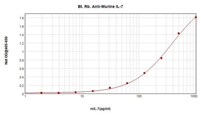 AA Sequence of recombinant protein: MECHIKDKEG KAYESVLMIS IDELDKMTGT DSNCPNNEPN FFRKHVCDDT KEAAFLNRAA RKLKQFLKMN ISEEFNVHLL TVSQGTQTLV NCTSKEEKNV KEQKKNDACF LKRLLREIKT CWNKILKGSI. Preparation: Produced from sera of rabbits immunized with highly pure Recombinant Murine IL-7. Anti-Murine IL-7-specific antibody was purified by affinity chromatography and then biotinylated. Sandwich ELISA: To detect Murine IL-7 by sandwich ELISA (using 100 μL/well antibody solution) a concentration of 0.25-1.0 μg/mL of this antibody is required. This biotinylated polyclonal antibody, in conjunction with PeproTech Polyclonal Anti-Murine IL-7 (500-P57) as a capture antibody, allows the detection of at least 0.2-0.4 ng/well of Recombinant Murine IL-7. Western Blot: To detect Murine IL-7 by Western Blot analysis this antibody can be used at a concentration of 0.1-0.2 μg/mL. When used in conjunction with compatible secondary reagents the detection limit for Recombinant Murine IL-7 is 1.5-3.0 ng/lane, under either reducing or non-reducing conditions. 500-P57BT-1MG will be provided as 2 x 500 μg
