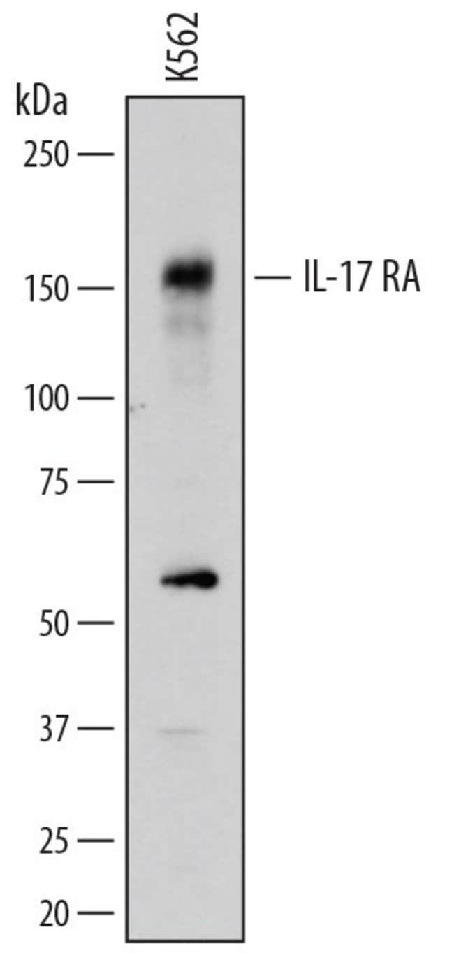 In direct ELISAs and Western blots, less than 1% cross-reactivity with recombinant mouse IL-17 RA/IL-17 R is observed. Reconstitute at 0.2 mg/mL in sterile PBS. Endoxin level is <0.10 EU per 1 μg of the antibody by the LAL method.