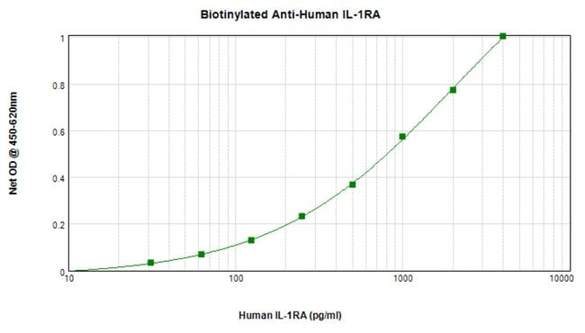 AA Sequence of recombinant protein: MRPSGRKSSK MQAFRIWDVN QKTFYLRNNQ LVAGYLQGPN VNLEEKIDVV PIEPHALFLG IHGGKMCLSC VKSGDETRLQ LEAVNITDLS ENRKQDKRFA FIRSDSGPTT SFESAACPGW FLCTAMEADQ PVSLTNMPDE GVMVTKFYFQ EDE. Preparation: Produced from sera of rabbits immunized with highly pure Recombinant Human IL-1RA. Anti-Human IL-1RA-specific antibody was purified by affinity chromatography and then biotinylated. Sandwich ELISA: To detect Human IL-1RA by sandwich ELISA (using 100 μL/well antibody solution) a concentration of 0.25-1.0 μg/mL of this antibody is required. This biotinylated polyclonal antibody, in conjunction with PeproTech Polyclonal Anti-Human IL-1RA (500-P209) as a capture antibody, allows the detection of at least 0.2-0.4 ng/well of Recombinant Human IL-1RA. Western Blot: To detect Human IL-1RA by Western Blot analysis this antibody can be used at a concentration of 0.1-0.2 μg/mL. When used in conjunction with compatible secondary reagents the detection limit for Recombinant Human IL-1RA is 1.5-3.0 ng/lane, under either reducing or non-reducing conditions. 500-P209BT-1MG will be provided as 2 x 500 μg