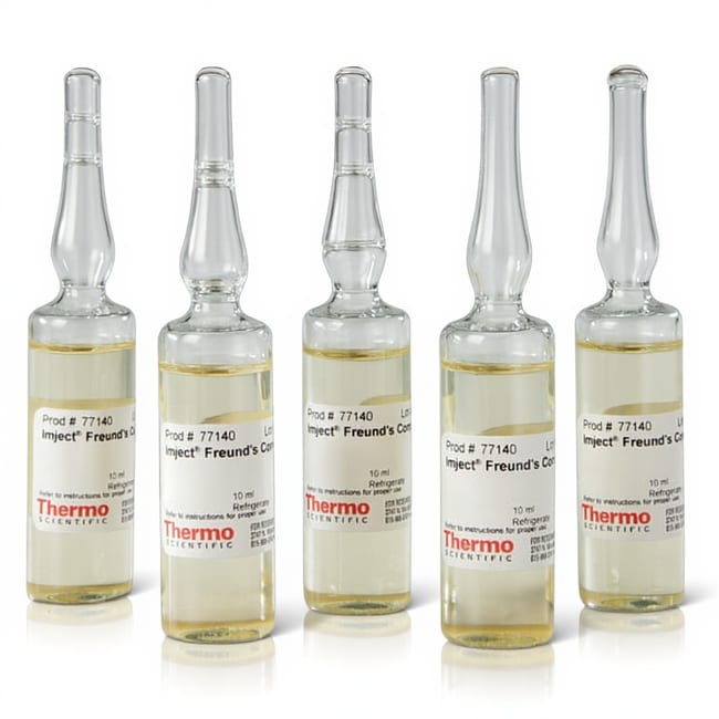 Thermo Scientific™ Imject Freund's Adjuvants are 10mL ampules of complete (FCA) and incomplete (FIA) formulations of a popular nonspecific stimulator of the immune response for use in antibody production immunization protocols.