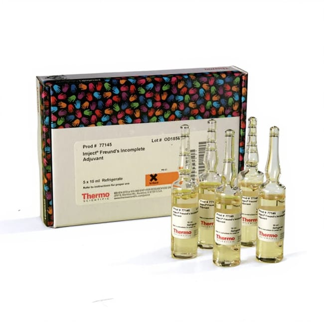 Thermo Scientific™ Imject Freund's Adjuvants are 10mL ampules of complete (FCA) and incomplete (FIA) formulations of a popular nonspecific stimulator of the immune response for use in antibody production immunization protocols.
