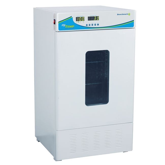 Accurate Temp. Control from 0 to 60 ° C S. S. Internal Chamber (65L) with Light Internal Worldwide-Universal Outlet Competitively Priced with "Heat Only" Incubators Uniquely Sized for Floor-Standing Use or on Bench Tops less than 32" Tall. The myTemp 65HC Incubator is designed to provide accurate and uniform temperature control from 0 to 60 ° C. The broad temperature range of the instrument expands the use of this incubator to both heating and cooling applications. A large, digital display allows for visualization of the chamber temperature and the remaining incubation time, while an internal light is included for improved visualization of the chamber. In addition, a built in, internal outlet can be used to provide power to small instruments, such as shakers, rockers, etc. With forced air technology and stainless steel inner construction, uniform heat transfer is ensured throughout the internal chamber. When set for sub-ambient temperatures, the powerful compressor is activated, quickl