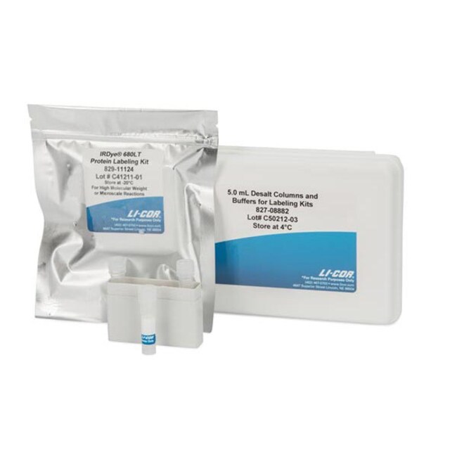 IRDye 680LT Protein Labeling Kits can be used to label antibodies and other proteins for applications such as Western blots and microscopy. The high molecular weight kit is optimized for labeling 1.0 mg of protein with molecular weight 45 - 200 kDa. This kit contains 3 x 0.125 mg IRDye 680LT Reactive Dye vials, 0.5 mL 1 M Potassium Phosphate (K2HPO4) (pH 9), 25 mL 1X PBS, 0.5 mL ultra-pure water, 3 x Pierce Zeba™ Desalting Spin Columns, Pierce Zeba Desalting Spin column instructions and Protocol for IRDye 680LT Protein Labeling Kit - High MW
