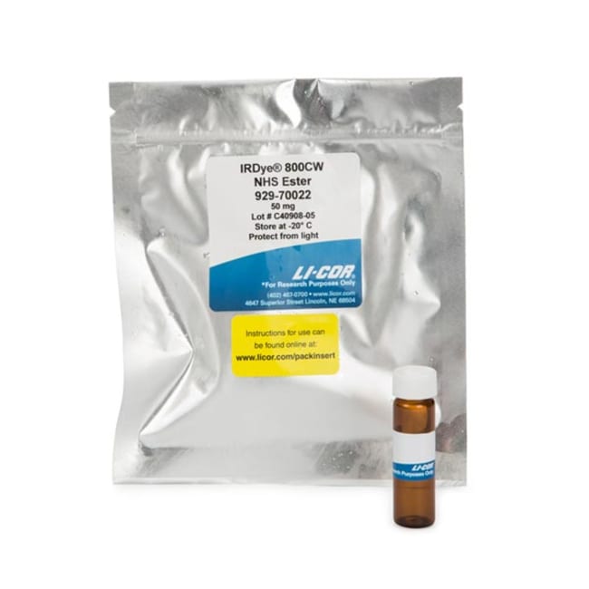IRDye infrared dyes from LI-COR Biosciences are available for researchers developing applications using near-infrared (NIR) fluorescence. These unique dyes are used in a variety of NIR imaging applications including Western blotting, plate-based assays, protein arrays, tissue section imaging, and molecular activity measurements. Standard NHS ester chemistry is used to produce custom probes labeled with LI-COR IRDye infrared dyes. The NHS ester reactive group provides the functionality for labeling primary and secondary amines, such as lysine residues in proteins.