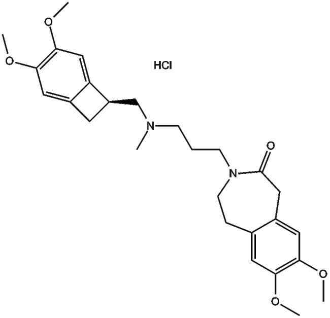 Ivabradine hydrochloride (CAS 148849-67-6) is a selective inhibitor of the If (funny) current in sinoatrial node cells By targeting the If channel Ivabradine reduces cardiac pacemaker activity leading to a dose-dependent decrease in heart rate without affecting myocardial contractility In vitro studies report an IC50 of 2 9 M for inhibition of the If current Owing to its specific action on heart rate modulation Ivabradine HCl is widely utilized in preclinical research investigating cardiac electrophysiology autonomic regulation and the development of heart rate lowering agents