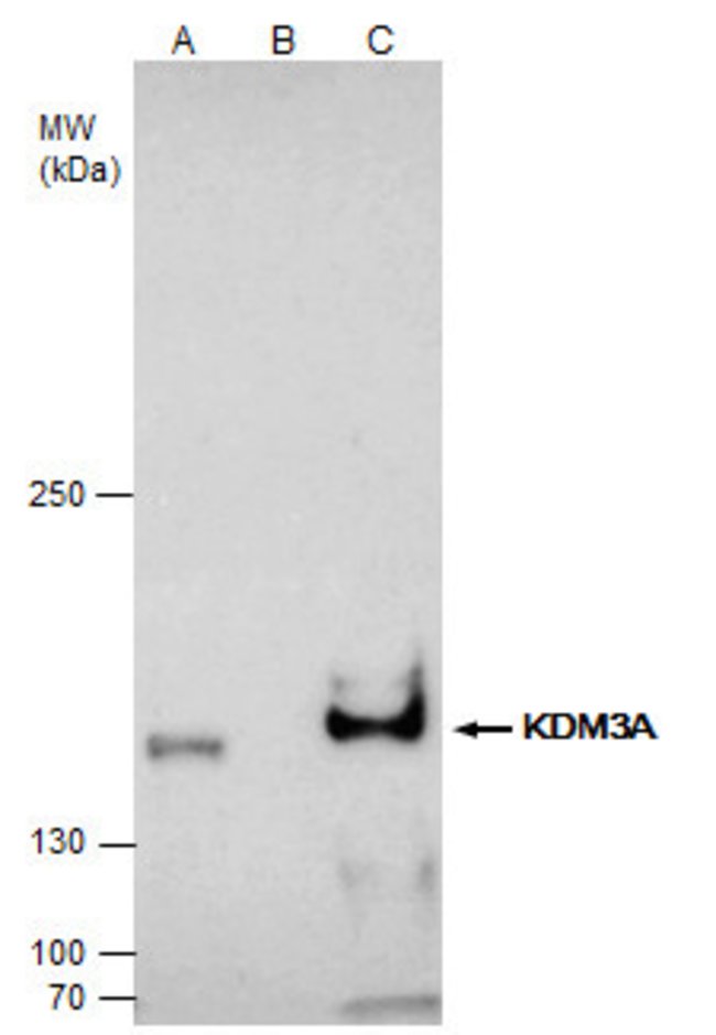 Recombinant protein encompassing a sequence within the center region of human KDM3A. The exact sequence is proprietary. | |