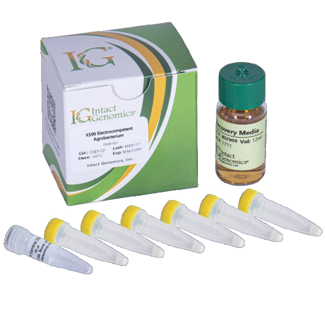 Intact Genomics (ig) K599 Agrobacterium ElectroCompetent Cells are made from a specific strain of Agrobacterium rhizogenes, Agrobacterium rhizogenes (str R) pRi2659 (agropine type). K599 was originally isolated from cucumber exhibiting hairy root disease symptoms and has been widely used for hairy root transformation (1).Agrobacterium rhizogenes is a soil-borne gram-negative bacterium that can infect most dicotyledons, a few monocotyledons, and some gymnosperms. IG’s K599 Agrobacterium ElectroCompetent Cells is optimized for the highest transformation efficiencies and is useful for transgenic operations of corn, soybean, cotton, peanut, dandelion, cowpea, and other plants. K599 Agrobacterium rhizogenes strain contains pRi2659 agrobacterium-type Ri plasmid and displays Spectinomycin resistance.Product Includes and Storage:K599 Agrobacterium ElectroCompetent Cells: -80 ºCpCAMBIA1391z control DNA: -20 ºCRecovery medium: 4 ºC