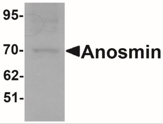 Antibody was raised against an 18 amino acid synthetic peptide near the center of human Anosmin. The immunogen is located within amino acids 430 - 480 of Anosmin. Amino Acid Squence: KVYWKKTEDPTVNRYHVR | |