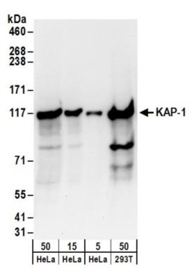 The immunogen recognized by this antibody maps to a region between residue 1 and 50 of human Tripartite Motif-Containing 28 using the numbering given in entry NP_005753.1 (GeneID 10155). | |
