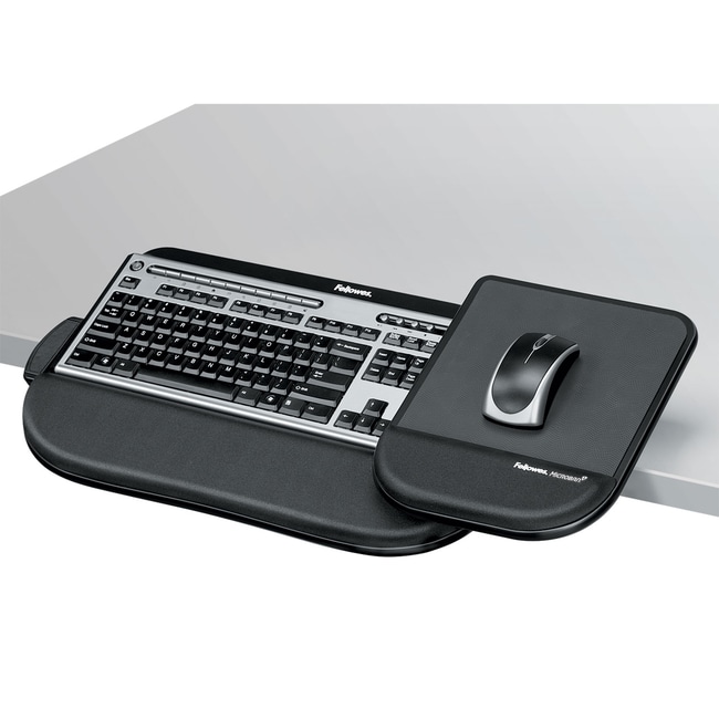 Features strong brackets that easily attach to desktop edge up to 1 75 thick without tools or surface damage allowing platform to effortlessly tilt and slide Extended knee clearance keeps you comfortable while typing and mousing Single lever easily adjusts tilt (flat to 30 ) and slide (4 63 travel distance) Unique textured surface keeps mouse from sliding off mousing platform Ultra soft memory foam wrist support with Microban antimicrobial product protection keeps product cleaner