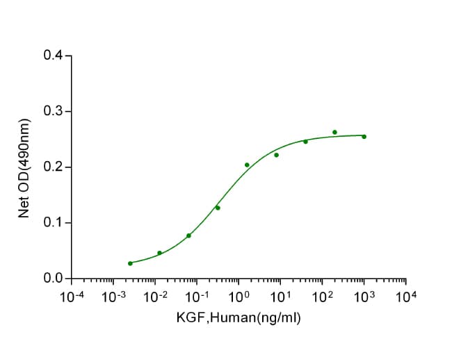 Keratinocyte Growth Factor (KGF) is a highly specific epithelial mitogen produced by fibroblasts and mesenchymal stem cells. KGF belongs to the heparin binding Fibroblast Growth Factor (FGF) family, and is known as FGF-7. However, in contrast to the FGF-1, which binds to all known FGF receptors with high affinity, KGF only binds to a splice variant of an FGF receptor, FGFR2-IIIb. FGFR2-IIIb is produced by most of the epithelial cells, indicating that KGF plays roles as a paracrine mediator. KGF induces the differen-tiation and proliferation of various epithelial cells, including keratinocytes in the epidermis, hair follicles and sebaceous glands, and is responsible for the wound repairs of various tissues, including lung, bladder, and kidney.