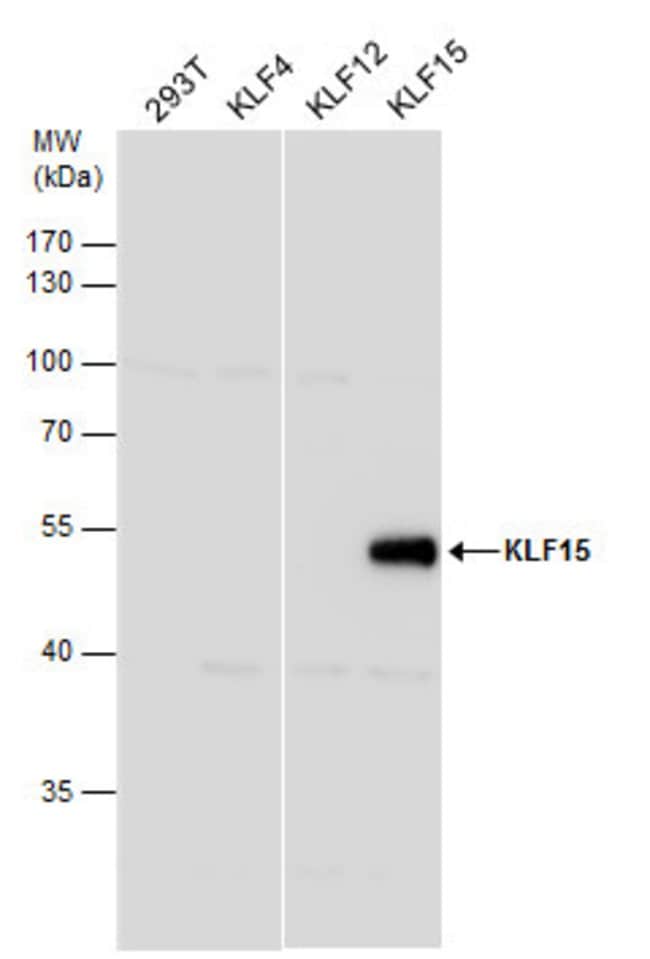 Recommended positive controls: 293T, A431, H1299, HeLaS3, HepG2, Molt-4, Raji, human KLF15-transfected 293T. Store product as a concentrated solution. Centrifuge briefly prior to opening the vial.