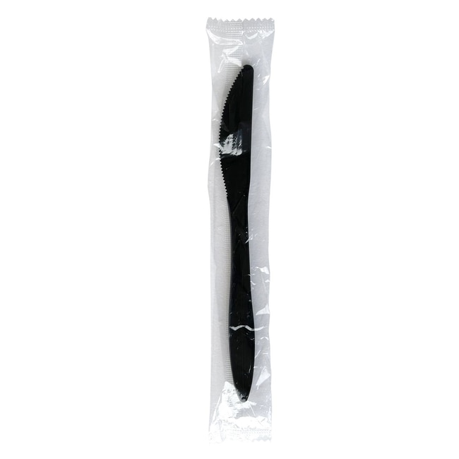 A great option for virtually any dining environment mediumweight wrapped polypropylene cutlery items offer quick event set-up or packing for to-go meals Individually packaged for convenience and to ensure utensils remain sanitary even after handling The utensils have the versatility to be used with most cuisines making them an ideal fit for takeout concession stands cafeterias offices events and outdoor gatherings Utensils Type- Knife Material Type- Plastic Material(s)- Polypropylene Color(s)- Black