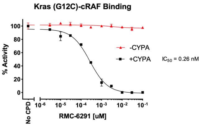 The Kras (G12C) Inhibitor assay kit is a TR-FRET based assay, which is designed to screen Kras inhibitors and determine the Kras-inhibitor binding affinity. Tag2-Kras (G12C) in this assay kit is loaded with GppNHp, which represents the activated Kras. The Ras binding domain (RBD) of cRAF has a Tag1 at N-terminus. A Terbium-labeled anti-Tag2 antibody binding to the Tag2-Kras serves as a fluorescence donor (HTRF donor), activation of which results in fluorescence resonance energy transfer (FRET) if Tag1-cRAF binds to the Kras, since the binding brings Terbium on the anti-Tag2 antibody close to the fluorophore on the anti-Tag1 antibody (HTRF acceptor). Thus, the binding status can be quantitively measured by calculating the ratio of the emission fluorescence intensity of the acceptor (665 nm) and donor (620 nm). If an inhibitor associated with CYPA binds to the Kras and blocks the cRAF binding, the HTRF signal will be reduced.