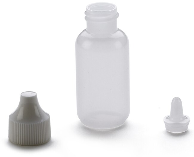 Round polyethylene bottle complete with dropper plug and cap for easy and precise liquid dispensing. Separate glass or plastic dropper available for 59 mL bottle.