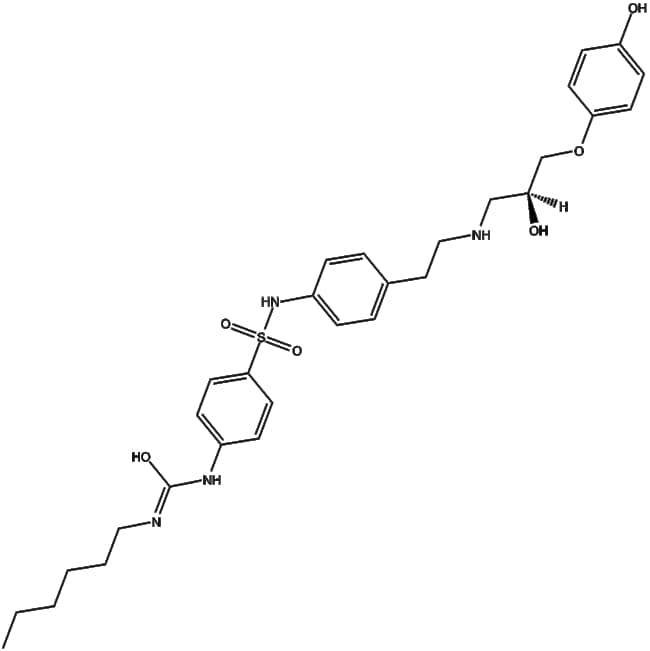 L-755 507 (CAS 159182-43-1) is a benzene sulfonamide derivative that functions as a partial agonist of the human 3-adrenergic receptor a G protein-coupled receptor involved in promoting lipolysis in adipose tissue L-755 507 exhibits high affinity for the 3 receptor (IC50 13 nM EC50 0 43 nM) and demonstrates over 440-fold selectivity compared to 1 and 2 adrenergic receptors In rhesus monkey models L-755 507 induces lipolysis in adipocytes (EC50 3 9 nM) and acutely elevates metabolic rate by approximately 30% following intravenous administration These properties make L-755 507 a valuable tool for studying 3-adrenergic receptor-mediated lipid metabolism and energy expenditure in preclinical research